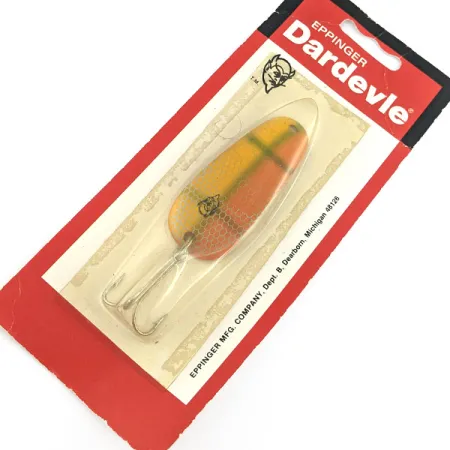 Tämä metallirunkoinen 7 gramman (1/4 oz) painoinen viehe esittelee Sagamore JT Buel -kuviota erittäin tarkasti. 6,5 cm (2 1/2") pituinen runko on jaettu kirkkaan keltaiseen ja syvän oranssiin väritykseen, jota halkovat pysty- ja vaakasuorat vihreät viivat muodostaen keskitetyn ristikon. Viehe on käyttämätön ja se on kiinnitetty alkuperäiseen Eppinger Mfg. Companyn myyntipakkaukseen, jossa on Dearbornin (Michigan) osoite. Tuotekoodilla 22924 varustetussa vieheessä on alkuperäinen tehtaan kolmihaarakoukku, ja lusikan pintaan on lyöty klassinen paholaisenpää-logo. Tässä USA:ssa valmistetussa harvinaisuudessa on päävärien päälle tehty teksturoitu vihreä pilkutus, joka on ominaista juuri tälle vintage-erälle. Itse taustapahvi, jossa on selkeä punainen Dardevle-brändäys, viittaa suoraan Eppingerin perinteeseen. Maalipinnan yksityiskohdat ovat säilyneet terävinä aina lämpimien sävyjen välisestä siirtymästä tarkasti maalattuihin vihreisiin raitoihin.