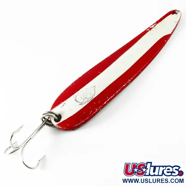 Nikkeli-viimeisteltyyn taustapuoleen selkeästi leimatut "SEADEVLET"- ja "DETROIT - U.S.A." -merkinnät vahvistavat tämän yksilön olevan peräisin legendaarisesta Eppingerin tehtaasta. Tässä vintage-lusikassa on etupuolella klassinen puna-valkoinen raitakuviointi ja valkoisen raidan keskellä ikoninen pirunaama-logo. Uistimen pituus on 10 cm ja paino 40 g, mikä antaa sille merkittävän heittopainon pitkiä heittoja varten. Maalipinnassa on aitoa luonnetta, pientä lohkeilua ja kulumaa reunoilla, ja sen kuntoarvio on 4/5, mikä korostaa sen historiaa vesillä. Omilla muoteilla valmistettu kovera muoto on suunniteltu tuottamaan sille ominainen hyllyvä uintiliike kelauksen aikana. Uistin on varustettu tukevalla kolmihaaralla, joka on kiinnitetty kestävällä uistinrenkaalla, valmiina kalastuspakkiin tai keräilyseinälle. Lou Eppinger siirsi tuotannon Detroitista Dearborniin vuonna 1959, joten tässä kappaleessa (tuotekoodi 3675) oleva "Detroit"-leima ajoittuu yrityksen satavuotisen historian aiemmalle aikakaudelle.
