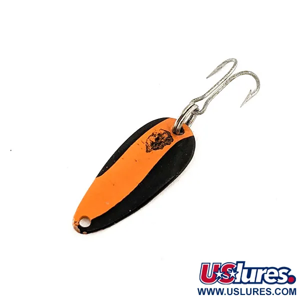 Tämän pienen 2,3 cm (1") lusikkauistimen kääntöpuolen kuparinsävyinen metalli tarjoaa lämpimän kontrastin etupuolen voimakkaalle emalille. Selkeästi "DARDEVLE SKEETER U.S.A." -tekstillä leimattu tausta paljastaa Lou Eppingerin Michiganissa sijaitsevan yrityksen perinnön, joka on valmistanut näitä vieheitä vuodesta 1906 lähtien. Vain 1 g (1/32 oz) painavassa yksilössä on silmiinpistävä musta viimeistely, jonka katkaisee kirkkaan oranssi vinoraita. Kalastajat suosivat usein tätä väriyhdistelmää, koska se luo erottuvan siluetin erilaisissa veden kirkkausasteissa. Emalissa on hieman luonnetta antavaa kulumaa siimalenkin lähellä, mikä on tyypillistä tämän aikakauden aidoille vintage-tuotteille. Viehe on varustettu terävällä kolmihaarakoukulla, joka on kiinnitetty uistinrenkaalla runkoon. Kuntoluokituksella 5/5 varustettu uistin on rakenteellisesti ehjä ja sen värit ovat säilyneet kirkkaina. Keräilijät tunnistavat tämän mallin tuotekoodista 11630. Nämä ultrakevyet lusikat suunniteltiin perinteisesti ahvenen tai taimenen heittokalastukseen ohuilla siimoilla.