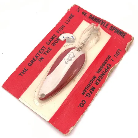 Huomiota herättävä puna-valkoraidallinen kuviointi luonnehtii tämän vintage-lusikkauistimen etupuolta, ja tämä väritys on säilynyt valmistajan valikoiman kulmakivenä vuosikymmeniä. Tämän Dardevle Spinnie -uistimen on valmistanut Lou J. Eppinger Mfg. Co. Dearbornissa, Michiganissa, ja siinä on erottuva paholaisenpää-logo leimattuna suoraan metalliin siimalenkin lähelle. Pituudeltaan 1 3/4" (4,5 cm) ja painoltaan 1/4 oz (7,1 g), kuten alkuperäispakkauksessa on ilmoitettu, uistimen pisaramainen muoto on tuttu näky pohjoisamerikkalaisissa pakissa. Yksilö on luetteloitu tuotekoodilla 3913 ja se on käyttämätön, edelleen kiinnitettynä alkuperäiseen myyntitaustaansa, joka kertoo yrityksen historiallisista juurista Michiganissa (Kunto 6). Rakenteessa on kovera metallirunko, joka on suunniteltu heittokalastukseen, sekä terävä kolmihaarakoukku, joka on kiinnitetty uistinrenkaalla perään. Metallipinta on kirkas eikä siinä ole merkkejä käytöstä, mikä säilyttää maalin ja hopeanvärisen alapuolen eheyden.