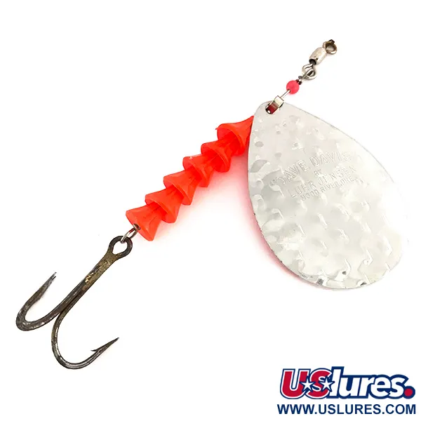 Vasaroitu nikkelipinta pisaranmuotoisessa lipassa tarjoaa klassisen heijastavan pinnan, joka on tunnusomaista tälle Luhr Jensen -mallille. Tämä 13 cm (5") pitkä ja 17 g (3/5 oz) painava Dave Davis UV -vetolippa (tuotekoodi 7673) sisältää viiden kartiomaisen muovihelmen sarjan fluoresoivassa oranssin-pinkissä sävyssä. Nämä helmet on suunniteltu reagoimaan ultraviolettivaloon, mikä tekee vieheestä näkyvän syvemmissä vesikerroksissa tai pilvisellä säällä. Lipan kääntöpuoli on viimeistelty mattapintaisella oranssilla, mikä antaa selkeän kontrastin kirkkaalle metalliselle etupuolelle. Peräpäässä on tummapintainen kolmihaarakoukku kiinnitettynä lankasilmukalla, ja etupäässä on leikari helpottamassa pyörimistä uistelun aikana. Kuntoluokituksella 4/5 vieheessä on hyvin säilynyt maalipinta ja kirkkaat metalliosat sen amerikkalaiselta valmistusajalta.