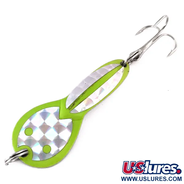 Kiillotettuun nikkelirunkoon lisätyt chartreuse-yksityiskohdat tekevät tästä 7 g (1/4 oz) lusikkauistimesta erittäin näkyvän erilaisissa vesiolosuhteissa. Tämä Dazzler #2, tuotekoodiltaan 10300, on yhdysvaltalainen Acme-klassikko, jonka valmistus on lopetettu, mikä tekee siitä halutun vintage-vieheen. Pituudeltaan 5 cm (2") lusikassa on omaleimainen tiimalasimuoto ja etupuolella teksturoitu holografinen prismaupotus valon heijastamiseksi. Vieheen kääntäminen paljastaa metallipintaan selkeästi lyödyn 'DAZZLER 2' -merkkileiman. Vaikka tuote toimitetaan ilman alkuperäispakkausta, se on käyttämätön, ja siinä on tallella tehtaan alkuperäinen viimeistely sekä kolmihaarakoukku. Kalastajat käyttävät tätä mallia yleensä heittokalastukseen tai uisteluun matalissa vesissä aina 1 metriin asti, erityisesti tavoitellessaan haukea virrattomissa vesissä. Rakenteeseen kuuluu kestävät uistinrenkaat molemmissa päissä siiman ja koukun varmaa kiinnitystä varten.