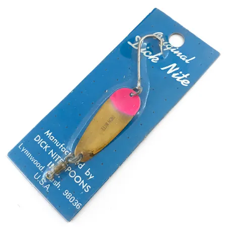 Tämän messinginsävyisen lusikan kirkkaan vaaleanpunainen pää luo voimakkaan kontrastin tavoitteen sekä taimenelle että lohelle. Kooltaan 3,5 cm (1 1/2") ja painoltaan 1,7 g (1/16 oz) oleva #2-koon lusikkauistin on Pacific Northwestin klassikko. Siinä on perinteinen Dick Nite -profiili ja yksittäiskoukku, joka on kiinnitetty tukevalla uistinrenkaalla peräpäähän. Metallirunkoon on lyöty "DICK NITE" -nimi aivan kultaviimeistellyn pinnan keskelle. Kevyisiin välineisiin suunniteltuja lusikoita käytetään tyypillisesti vetouistelussa tai heittokalastuksessa jokivesistöissä, joissa tarvitaan hienovaraista välkettä. Alkuperäisessä Lynnwoodista, Washingtonista kotoisin olevassa sinisessä "Dick Nite Spoons" -pahvipakkauksessa säilyneen yksilön löytäminen on keräilijän unelma; tämä kyseinen kappale on käyttämätön ja erinomaisessa kunnossa. Valmistettu Yhdysvalloissa, ja pakkauksen Lynnwood-osoite osoittaa brändin pitkäaikaiseen perintöön Washingtonin osavaltion kalastuskulttuurissa.
