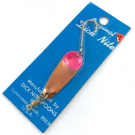 Kiillotetun kuparirungon päälle maalattu kirkkaan vaaleanpunainen kärki on ominainen tälle vintage-tyyliselle Dick Nite #2 -lusikkauistimelle, joka on yhä kiinni alkuperäisessä sinisessä pahvissaan. Painoltaan 1,7 g (1/16 oz) oleva pieni lusikka edustaa Washingtonin Lynnwoodin perinteikästä uistinvalidmistusta. 3,5 cm (1 1/2") metallirunkoon on selkeästi stanssattu valmistajan nimi, ja sen päässä on messinginvärinen leikari. Tuotekoodilla 5318 tunnistettava yksilö on käyttämätön, ja sen pinta on puhdas ilman kulumisen merkkejä. Hopeanvärinen koukku pysyy paikallaan pakkauksen muovisuojassa, säilyttäen alkuperäisen kokoonpanon täysin muuttumattomana. Kuntoluokitus on 6, sillä viehe on käyttämätön ja se toimitetaan alkuperäisessä myyntipakkauksessaan.