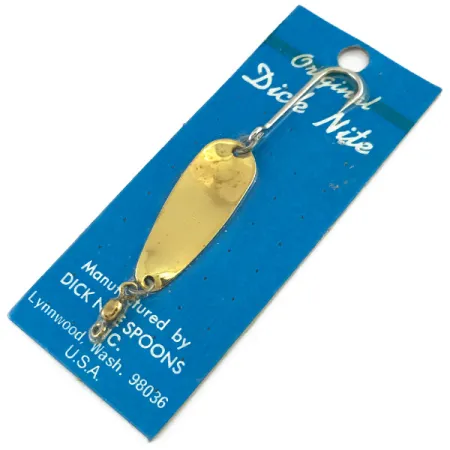 Kultaus tarjoaa erinomaisen näkyvyyden tälle Dick Nite #2 -uistimelle, joka on kotoisin valmistajan kotipaikasta Lynnwoodista, Wash. 98036, USA. Paino 1/16 oz (1,7 g) ja pituus 1 1/2" (3,5 cm) tekevät siitä suositun valinnan kevytvälinekalastajille, jotka tavoittelevat lajeja kuten taimenta tai kokanee-lohta. Lusikkauistimessa on ohut profiili, joka on suunniteltu sekä uisteluun että heittokalastukseen. Tuotekoodilla 8020 varustettu uistin on käyttämätön yksilö, joka on edelleen kiinni alkuperäisessä sinisessä taustapahvissaan, ja sen kuntoluokitus on 6. Etusilmukkaan on kiinnitetty valmis leikari siiman hallinnan helpottamiseksi, ja takana on tukeva yksihaarakoukku.