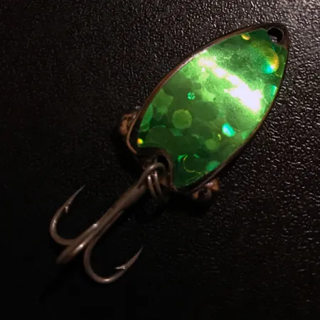 Vihreät holografiset suomukuviot peittävät tämän 3 cm (1 1/4") metallisen blade-vieheen yläpuolen tarjoten erittäin näkyvän fluoresoivan välkkeen, joka reagoi UV-valossa. Fish Itt First Lure Co:n Yhdysvalloissa valmistama Double Dancer sisältää erottuvan painotetun profiilin, joka on suunniteltu heittokalastukseen tai vertikaalijigaukseen. Alapuolen kiillotettu nikkeliviimeistely luo vahvan kontrastin kirkkaanvihreälle suomukuviolle, mikä saa aikaan terävän visuaalisen välkkeen. Tämä tuotekoodilla 12500 tunnistettu yksilö on säilyttänyt kirkkaan ulkonäkönsä, ja sen osat sekä viimeistely ovat erinomaisessa kunnossa (arvosana 5/5). Vieheen 7 g (1/4 oz) paino on keskitetty keskiosaan, mikä takaa vakauden ja pitkät heitot. Siiman kiinnityspiste kapeassa nokassa ja uistinrenkaalla kiinnitetty kolmihaarakoukku pyrstössä ovat tyypillisiä tälle amerikkalaiselle mallille, tehden tästä hienosti säilyneen keräilykohteen fluoresoivien vintage-uistinten ystäville.