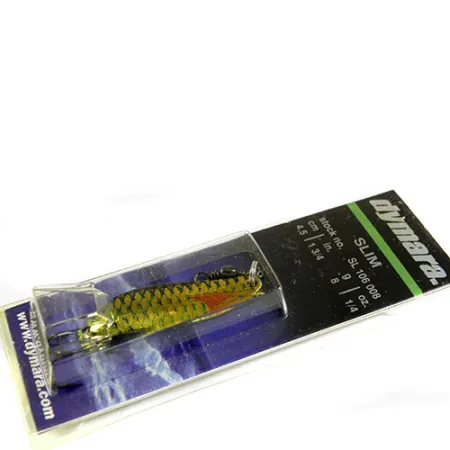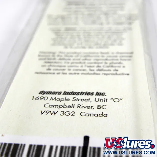 Tämä Kanadassa valmistettu lusikkauistin on pituudeltaan tasan 4,5 cm (1 3/4"), ja siinä on klassinen ahven-kuviointi erottuvilla kultaisilla suomuilla ja eloisalla puna-oranssilla korostuksella pyrstöä kohti. Dymara Industriesin Campbell Riverissä, Brittiläisessä Kolumbiassa valmistama Slim-malli — tuotekoodilla 0836 — on harvinainen löytö valmistajalta, joka on sittemmin lopettanut toimintansa. Painoltaan 8 g (1/4 oz) viehe on suunniteltu monipuoliseen käyttöön, kuten heittokalastukseen, uisteluun ja jigaamiseen. Lusikan etuosaan on asennettu tukeva tynnyrileikari, kun taas kääntöpuolella on kirkas, erittäin näkyvä kromiviimeistely. Tuote on käyttämätön ja säilytetty alkuperäisessä tehdaspakkauksessaan, jossa on edelleen valmistajan osoite.