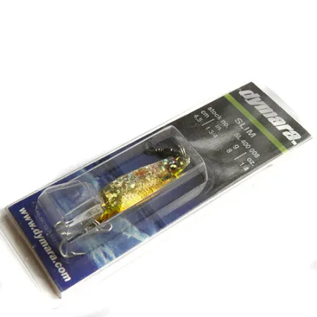 Tämä 8g (1/4oz) painava Dymara-lusikka on viimeistelty eloisalla Kirjolohi-kuviolla, joka heijastaa valoa sen teksturoidusta pinnasta. Dymara Industriesin Kanadassa valmistama yksilö on luetteloitu tuotekoodilla 0838 ja se on pituudeltaan kompakti 4,5cm (1 3/4"). Pakkaus tunnistaa tämän "Slim"-malliksi, tarkemmin varastonumerolla SL 400 008. Viehe on alkuperäisessä myyntipakkauksessaan ja sen kuntoarvio on 6, mikä tarkoittaa, että se on käyttämätön ja säilynyt täsmälleen sellaisena kuin se lähti Campbell Riverin tehtaalta. Monipuoliseen käyttöön suunniteltu viehe soveltuu pakkauksen mukaan heittokalastukseen, uisteluun ja jigaukseen, varoituksella ettei viehettä saa taivuttaa. Varustukseen kuuluu terävä kolmihaarakoukku ja kestävä uistinrengas, jotka ovat tyypillisiä tämän sittemmin lopetetun valmistajan luotettavalle laadulle. Kirjolohi-kuvio on tarkasti viimeistelty kimaltelevilla kultaisilla ja hopeisilla suomuilla, joita korostavat hienovarainen vaaleanpunainen kylkiviiva ja tummat pilkut.