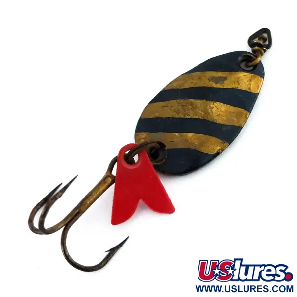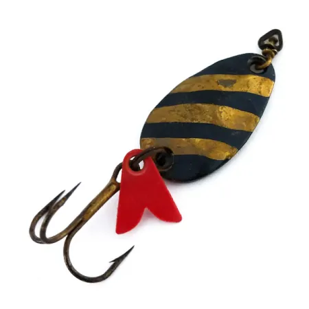 Messinkirakenne muodostaa perustan tälle aidolle EGB Swiss-made -lusikalle, joka on kooltaan kompakti 2,5 cm (1"). Metallin toisella puolella on näyttävä mustien ja kultaisten raitojen kuvio, kun taas kääntöpuolella on aito "EGB SWISS MADE" -leima selvästi painettuna teksturoituun pintaan. Kevyen 3 g (3/32 oz) painoinen viehe on varustettu alkuperäisellä kolmihaarakoukulla ja sille ominaisella punaisella muovisella houkutinlevyllä takarenkaassa. Nämä uistimet tunnettiin historiallisesti korkealaatuisista materiaaleistaan, ja jokainen kappale on käsin vasaroitu messinkipinnassa näkyvien erityisten kolojen luomiseksi. Tuotekoodilla 9753 tunnistettu uistin on säilynyt siistinä ja sen osat ovat hyvässä kunnossa, ansaiten kuntoluokituksen 4/5. Yläosan lankarakenne sisältää pienen leikarilenkin, mikä on tyypillistä tuon ajan sveitsiläisten kalastustarvikeliikkeiden tarkkuusvalmistukselle.