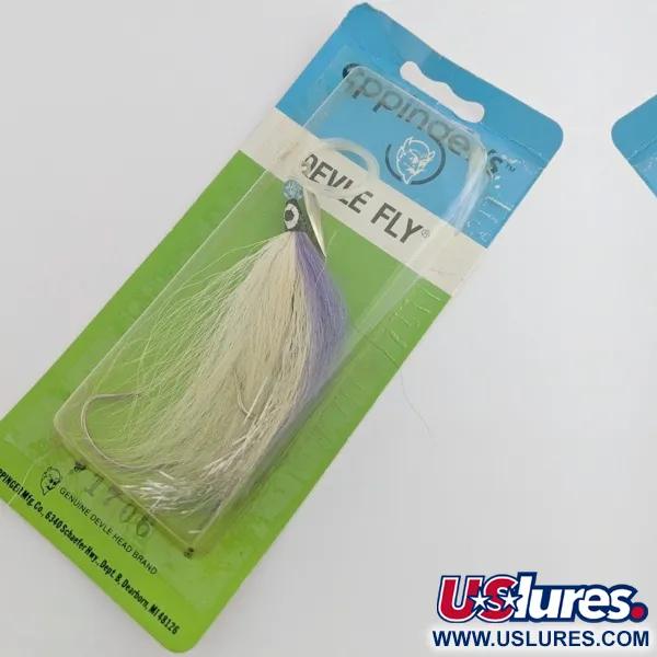 Purppuranpunainen ja valkoinen peurankarva (bucktail) muodostaa tämän erikoistuneen vetouistelulaitteen visuaalisen profiilin. Malli on yhdistelmä perinteistä lusikkauistinta ja perhoa. Lou J. Eppinger Mfg. Co:n Dearbornissa, Michiganissa valmistama Devle Fly hyödyntää akselilla vapaasti pyörivää metallilehteä välkkeen luomiseksi vedettäessä. Tässä yksilössä (tuotekoodi 24438) on nikkeliviimeistelty lehti ja valko-purppuralla sidottu koukku. Se on suunniteltu syvän veden vetouisteluun, ja sitä käytetään usein yhdessä houkutuslevyn tai houkuttimen kanssa pyydettäessä harmaunieriää ja muita lohikaloja. Uistin on alkuperäisessä vihreä-sinisessä pahvipakkauksessaan ja se on käyttämätön (kuntoluokitus 6). Kokonaisuus sisältää peurankarvaan integroidun yksittäiskoukun, mikä säilyttää virtaviivaisen profiilin uisteltaessa. Perhon lyijyosaan maalattu silmä tarjoaa tarkan iskupisteen pyörivän nikkelilehden takana.