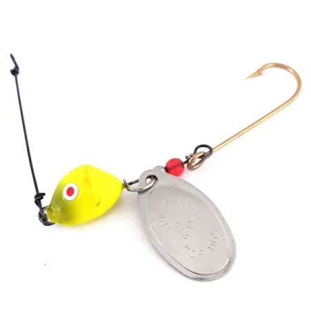 Nikkelöidyt ovaalit lipat ja voimakkaan keltainen lyijypää erottavat tämän Erie Dearie Top Dog -vieheen, joka on klassikkolöytö jokaiselle Suurten järvien kalastajalle. Painoltaan 1/2 oz (14 g), painopisteeltään etupainoisen muotoilun viimeistelee kirkkaankeltainen maalaus, jossa on korkeakontrastinen puna-valkoinen iskusilmä. Hopeanväriseen lippaan on selkeästi leimattu valmistajan merkki, ja se on erotettu kullanvärisestä koukusta yhdellä punaisella houkutinhelmellä ja tukevalla lankarungolla. Valmistettu Yhdysvalloissa, tässä yksilössä on tuotekoodi 10002 ja se on rakennettu pitkävartiseen koukkuun, joka on tarkoitettu käytettäväksi elävän syötin tai jiggien kanssa. Vieheen kunto on erinomainen (5/5), ja alkuperäinen pinnoite sekä osat ovat säilyneet poikkeuksellisen puhtaina.