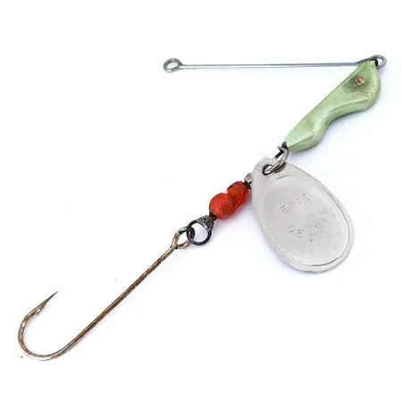 Painotettu etuosa määrittelee tämän vintage-mallisen Walleye Killer -uistimen, jossa on stansattu nikkelilippa osoittamassa sen Erie Dearie -alkuperää. Painoltaan 2/5 oz (12 g) oleva uistin käyttää erottuvaa vaaleanvihreää lyijyrunkoa, joka antaa tarvittavan painon syviin rakenteisiin heittämiseen. Lipan ja pitkävartisen yksihaarakoukun välissä kaksi läpikuultavaa oranssia helmeä tarjoavat hienovaraisen visuaalisen kontrastin metalliosille. Tämä nimenomainen yksilö, tuotekoodiltaan 10430, on erinomaisessa kunnossa arvosanalla 5/5, ja nikkeliosien pinta on säilynyt kirkkaana. Runko on suora ja painopään vihreä maali on suurelta osin ehjä, mikä on tyypillistä hyvin säilyneelle palalle Lake Erien kalastushistoriaa.