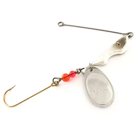 Selvästi tuotemerkillä leimattu, tämän spinnerbaitin kirkas nikkelipintainen lippa toimii ensisijaisena visuaalisena houkuttimena. Painoltaan 1/2 oz (14 g), tämä Erie Dearie Walleye Killer (tuotekoodi 12120) on klassinen esimerkki Yhdysvalloissa valmistetusta vieheestä, joka on suunniteltu erityisesti Suurilla järvillä suosittuihin painopäätekniikoihin. Rakenteessa on valko-hopeinen kalanmuotoinen pää, jota seuraa kolmen helmen sarja – kaksi eloisan oranssin ja punaisen sävyissä sekä yksi pieni metallinen välike. Peräpäähän on kiinnitetty terävä kultapäällysteinen yksittäiskoukku, joka on valmis varustettavaksi lierolla, kuten tälle viehetyypille on perinteistä. Lankavarsi on suora ja hyväkuntoinen, päättyen siistiin silmukkaan suoraa siiman kiinnitystä varten. Tämä yksilö on 5/5-kunnossa, pinnat ovat puhtaat eikä metalliosissa tai nikkelipinnoitteessa ole käytön jälkiä.