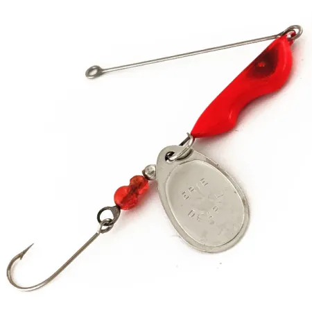 Ikonisella 'ERIE DEARIE' -nimellä leimattu nikkelilippa istuu klassisessa painopäärakenteessa, joka on ollut Suurten järvien kalastajien vakiovaruste sukupolvien ajan. Tässä nimenomaisessa mallissa (tuotekoodi 12160) on kirkkaanpunainen lyijyrunko, joka paljastaa toiminnallisen syvyytensä UV-valossa, jolloin viimeistely muuttuu kirkkaaksi neonhohdoksi. 1/2 oz (14 g) paino on keskitetty päähän, mikä tekee siitä erinomaisen valinnan pitkiin heittoihin tuulessa tai syvyyden säilyttämiseen ajelehtiessa kivikkoisten matalikkojen päällä. Kokonaisuus sisältää kaksi punaista koristehelmeä lankasilmukan ja lipan kiinnikkeen välissä, ja päättyy terävään yksittäiskoukkuun, joka on tarkoitettu lierolla varustettavaksi. Kunto on 5/5, ja se on säilyttänyt alkuperäisen tehdashohdon ja nikkelipinnoitteen kiillon. Valmistettu Yhdysvalloissa, muotoilu luottaa pyörivän lipan välkkeeseen ja painotettuun päähän saavuttaakseen pohjan tuntumassa lymyilevät valkosilmäkuhat heitto- ja uistelutilanteissa.
