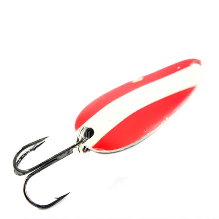 Tämän metallisen lusikkauistimen kupera puoli on kuvioitu perinteisillä punavalkoisilla raidoilla, edustaen Glen Evans -kuvaston ajatonta muotoilua. Valmistaja, jonka kotipaikka on USA, on leimannut "EVANS"-nimen koveran puolen kiillotettuun nikkelipintaan. Pituudeltaan 2 1/2" (6,5 cm) ja painoltaan 3/4 oz (21 g) oleva viehe on riittävän painava pitkiin heittoihin tai uisteluun. Siinä on vankka kolmihaarakoukku, joka on kiinnitetty tukevalla uistinrenkaalla perään. Yleiskunto on vakaa 4/5, ja siinä on vain vähäisiä käytön jälkiä maalin ja metallin kiillon ollessa yhä tallella. Tämä malli on luetteloitu tuotekoodilla 2907. Nikkelinen taustapuoli tarjoaa voimakkaan välkkeen yläpuolen selkeitä punavalkoisia raitoja vasten.