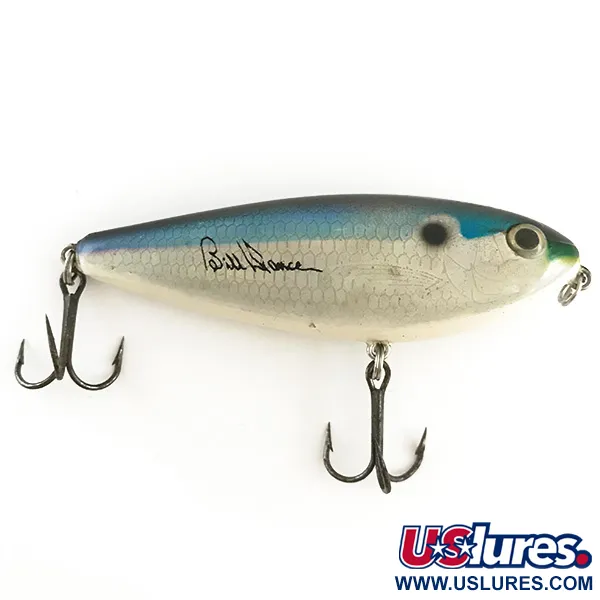 Yksityiskohtainen suomukuvio peittää tämän 8 cm pitkän pintakalastuksen klassikon runkoa, jossa on syvännsininen selkä ja hopeanvalkoiset kyljet. Bill Dancen nimikirjoitus on näkyvästi esillä erottuvan mustan shad-täplän vieressä, mikä osoittaa tämän olevan signature-sarjan viehe. Viehe painaa 13 g, sen tuotekoodi on 6520, ja se on varustettu kahdella vahvalla tummalla kolmihaarakoukulla. Heddonin Excalibur-mallistoon valmistama viehe sisältää sisäänrakennetun helistinkammion ääniärsykkeen luomiseksi. Vaikka sitä käytetään pääasiassa pintakalastustekniikoihin, se on luokiteltu 0,5 metrin syvyyteen asti. Kuntoarvio 5/5 näkyy rungon siistissä viimeistelyssä ja hartiaosan terävissä "Excalibur SPIT'N IMAGE" -merkinnöissä. Suuri, realistinen silmä kultaisella iiriksellä toimii katseenvangitsijana lähellä etukiinnityslenkkiä.