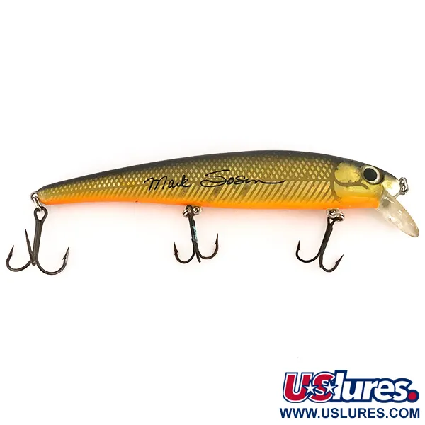 Tämä kapearunkoinen 12 cm (4 3/4") pituinen jerkbait on merkittävä osa kalastushistoriaa ajalta ennen kuin Heddon osti XCalibur-tuotemerkin. Tässä Mark Sosin -nimikkömallissa on legendan kursiivi allekirjoitus kyljessä ja tuotekoodi 7646. Viimeistelynä on yksityiskohtainen kultainen suomukuvio selässä ja huomiota herättävä oranssi vatsa, joka tunnetaan alkuperäisessä luettelossa värinä 3. Painoltaan 12 g (2/5 oz) uistin on tyypiltään suspendi, eli se jää paikalleen vesipatsaaseen pysäytysten aikana. Varustukseen kuuluu kolme mustanikkeliä kolmihaarakoukkua ja kestävä, kirkas uintilevy, joka on säädetty 0,9 - 1,5 metrin (3 - 5 ft) syvyysalueelle. Uistin on erinomaisessa kunnossa (5/5), pinnat ovat puhtaat ja osat ehjät. Heitto- ja nykäisykalastukseen (twitching) kehitetty runko heijastaa aikakauden korkealaatuista yhdysvaltalaista valmistustaitoa.