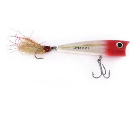 Tämä 10 g (1/3 oz) painava viehe edustaa klassista kontrastia: kirkkaanpunainen pää yhdistettynä teksturoituun hopeavalkoiseen kylkeen. Tämän Excalibur Super Pop-R -mallin pituus on 8 cm (3 1/4") ja siinä on syvä kovera suu, joka on suunniteltu roiskuttamaan vettä pinnalla 0 metrin syvyydessä. Holografisessa pinnassa on joitakin aikakaudelle tyypillisiä kevyitä jälkiä (kuntoluokitus 4/5), mutta se tarjoaa silti XCaliburille ominaisen välkkeen. Keräilijät tunnistavat tuotteen koodilla 10014. Taka-kolmihaarakoukku on koristeltu kullanvärisillä ja punaisilla kuiduilla, mikä toimii visuaalisena iskupisteenä, joka liikkuu silloinkin, kun viehe on paikallaan. XCalibur yhdisti tämän koristellun pyrstön suomukuvioituun runkoon matkiakseen pakenevaa täkykalaa ahvenen tai hauen kalastuksessa. Suuret tummat silmät on upotettu syvälle punaiseen päähän, tarjoten selkeän kiintopisteen seuraaville kaloille.
