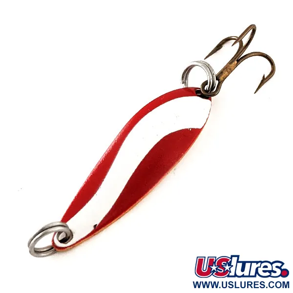 Punaiset ja valkoiset emalliaallot kulkevat tämän 3,5 cm (1 1/2") lusikkauistimen etupuolella, vastakohtana kiillotetulle kullatulle takapuolelle, jossa "Fiord Jr" -leima on selkeä ja luettavissa. Kuntoluokitukseltaan 6 oleva uistin on käyttämätön ja siinä on se puhdas ja kirkas ulkonäkö, jota vintage-amerikkalaisten metalliuistimien keräilijät etsivät. Tuotekoodilla 11975 varustettu lusikka painaa 3,4 g (1/8 oz) ja on monipuolinen valinta sekä heitto- että jigaustekniikoihin. Varustukseen kuuluu kestävä pronssinen kolmihaarakoukku, joka on kiinnitetty uistinrenkaalla, mikä heijastaa Acmen tunnettua yksinkertaista ja tehokasta rakennetta ennen mallin valmistuksen lopettamista. Toinen uistinrengas pään kohdalla toimii tämän klassisen yhdysvaltalaisen lusikan ensisijaisena kiinnityspisteenä.