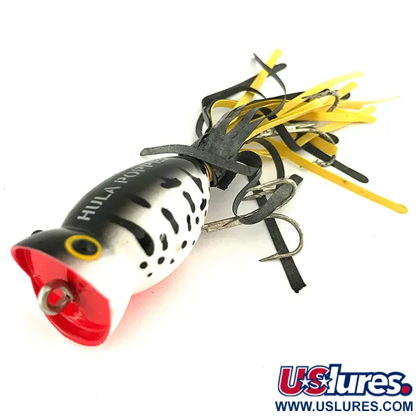 Silmiinpistävä valkoinen leopardikuvio rohkeilla mustilla täplillä luonnehtii tätä vintage-pintauistinta. Tuotekoodilla 7428 varustettu Fred Arbogast Hula Popper on erinomainen esimerkki vuosisadan puolivälin amerikkalaisesta käsityötaidosta. Kooltaan 4 cm (1 1/2") ja painoltaan 8 g (1/4 oz) oleva uistin on säilyttänyt alkuperäisen kiiltonsa. Syvään koverrettu punainen suu on yhdistetty kaksiväriseen kelta-mustaan kumihapsuun, joka on pysynyt huomattavan notkeana. Tämä yksilö on luokiteltu kuntoon 5/5, eikä maalatussa rungossa tai vatsan koukkukiinnikkeissä ole merkkejä käytöstä. HULA POPPER -brändäys on selvästi leimattu tummaan selkään, mikä erottuu valkoisista kyljistä ja suurista keltaisista silmistä. Kaksi kolmihaarakoukkua on kiinnitetty aikakaudelle tyypillisillä ruuvilenkeillä.