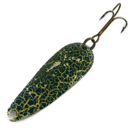 Tämän 5,5 cm (2 1/4") pituisen lusikkauistimen kiillotettuun nikkelipohjaan on stanssattu legendaarinen nimi "GADABOUT GADDIS" kunnianosoituksena vuosisadan puolivälin kuuluisalle "Flying Fishermanille". Painoltaan 9 g (1/3 oz) uistin on varustettu kuperalla puolella klassisella Frog-viimeistelyllä, jossa on syvänvihreä pohjaväri ja keltakultainen särökuviointi. Tämä yksilö, tuotekoodiltaan 9482, edustaa yhdysvaltalaisen kalastusvälinevalmistuksen merkittävää aikakautta. Varusteet ovat alkuperäiset: kestävä uistinrengas ja terävä pronssiviimeistelty kolmihaarakoukku. Kuntoarvio on 4/5; siinä on vain vähäistä pinnan ikääntymistä, joka heijastaa sen historiaa vaarantamatta maalin tai metallin kestävyyttä. Roscoe "Gadabout" Gaddis teki nämä lusikat tunnetuiksi televisiourallaan, ja ne on suunniteltu monipuolisiksi työkaluiksi heittoon tai uisteluun. Nikkelipinnoite antaa kirkkaan välkkeen tekstuurimaalin alta, mikä on tarkoitettu luomaan visuaalista kontrastia vedessä.