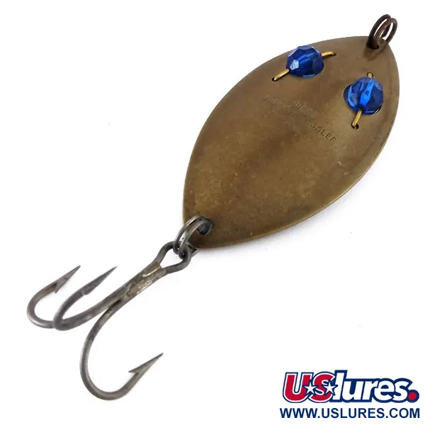 Tämä 9 cm (3 1/2") pituinen leveärunkoinen pisaranmuotoinen lusikkauistin on tyypillinen esimerkki vuosisadan puolivälin amerikkalaisesta metallityöstä. Tämä kyseinen Gibbs One Eye Wiggler, jota historiallisissa luetteloissa usein kutsutaan Ruby Eye -variantiksi, on valmistettu Yhdysvalloissa ennen vuotta 1970. Pronssinvärinen messinkirunko antaa luonnollisen, hillityn välkkeen, jota täydentävät kaksi erottuvaa sinistä fasettihiottua helmeä, jotka on kiinnitetty metallihakasilla. Nämä helmet toimivat uistimen "silminä" ja ne on suunniteltu heijastamaan valoa eri tavalla kuin perinteiset maalatut pinnat. 35 gramman (1 1/4 oz) paino tekee siitä erinomaisen valinnan heittokalastukseen tai syvän veden uisteluun. Metallipinta on puhdas ja hyvin säilynyt, mikä osoittaa alkuperäisen valmistuksen korkean laadun. Vankka kolmihaarakoukku on kiinnitetty vahvalla uistinrenkaalla, valmiina kovaan käyttöön makeassa vedessä tai rannikkokalastuksessa. Tuotekoodilla 10169 varustettu yksilö on poikkeuksellisessa 5/5-kunnossa ja se on upeasti säilynyt osa klassista kalastushistoriaa.