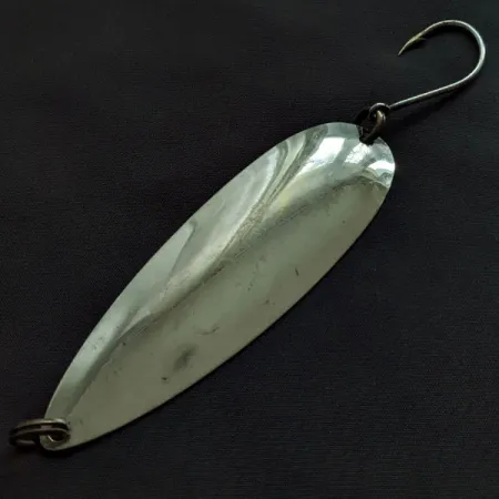 Metallin koveraan pintaan selkeästi meistetty 'GIBBS SICAMOUS 4' -kaiverrus yksilöi tämän tunnetun valmistajan klassisen uistelulusikan. Korkeakiiltoinen nikkeliviimeistely heijastaa valoa tehokkaasti koko 10 cm (4") pituudeltaan, mikä takaa hyvän näkyvyyden vaihtelevissa vesiolosuhteissa. Tämä 17 gramman (3/5 oz) painoinen yksilö, tuotekoodiltaan 21433, edustaa Gibbsin USA:n tuotannolle tyypillistä pisaramallia. Varustukseen kuuluvat tummat uistinrenkaat molemmissa päissä sekä uisteluun tarkoitettu suuri ja terävä yksihaarakoukku. Sen solakka ja pitkänomainen runko on ominainen Sicamous-sarjalle, jonka keräilijät tuntevat pelkistetystä mutta tehokkaasta muotoilusta. Pinnassa on vain minimaalisia käsittelyn jälkiä, ja se saa arvosanan 5/5 säilyneen kiiltonsa ansiosta. Tummat uistinrenkaat luovat vahvan kontrastin uistimen kirkkaalle, peilimäiselle nikkelipinnoitteelle.