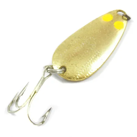 Kultaus ja kuvioitu suomupinta määrittelevät tämän Glen Evans 576 -lusikkauistimen ulkoasun. Kaksi keltaista täplää sijaitsevat rungon leveämmässä päässä, tarjoten jyrkän värikontrastin metallipintaa vasten. Kääntöpuolella on selkeä leima, josta ilmenee Glen Evans -tuotemerkki ja mallinumero 576, mikä vahvistaa sen amerikkalaisen alkuperän. Tämän yksilön pituus on 4 cm (1 1/2") ja paino 5,5 g (3/16 oz). Kuntoarvio on 4/5 ja pinnat ovat hyvin säilyneet. Varustukseen kuuluvat alkuperäiset uistinrenkaat siiman kiinnitystä varten sekä kapeaan päähän kiinnitetty kolmihaarakoukku, kaikki luetteloitu tuotekoodilla 3245.
