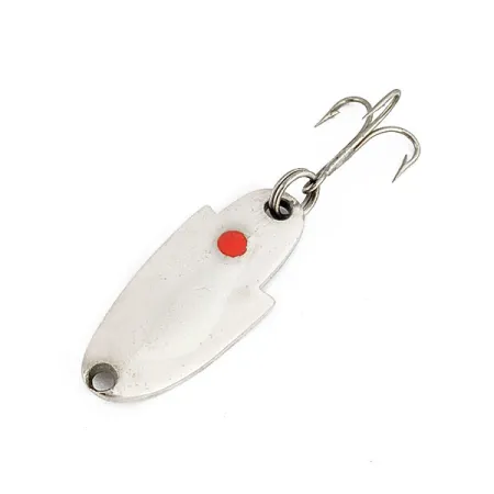 Pituudeltaan 3,5 cm (1 1/2") oleva perinteinen metallinen lusikkauistin edustaa Glen Evansin selkeää suunnittelufilosofiaa. Kääntöpuolelle on stanssattu selkeästi valmistajan merkintä ”EVANS #561”, joka tunnistaa tämän kyseisen mallin heidän historiallisessa valikoimassaan. 5,7 gramman (3/16 oz) paino tekee siitä monikäyttöisen valinnan kevytkalastusvälineille tarjoten riittävän massan hallittuihin heittoihin. Nikkelinvärisen rungon etupuolella on yksi selkeä punainen piste – tyypillinen visuaalinen ärsyke, jota käytettiin vuosisadan puolivälin malleissa simuloimaan iskupistettä. Rakenteessa on yksinkertainen läpivienti kärjessä siiman kiinnitystä varten, ja peräpäässä on tukeva uistinrengas kirkkaan kolmihaarakoukun kiinnittämiseen. Tuotekoodilla 17984 varustetulla yksilöllä on puhdas, heijastava pinta, ja se on 5/5 kunnossa.