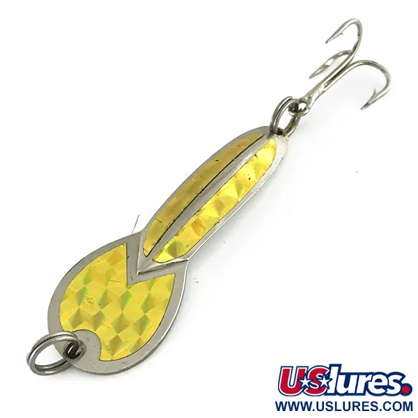 Heijastava kultainen timanttikuvioinen prismateippi peittää tämän 17 g (3/5 oz) nikkelisen lusikkauistimen etupuolen ja heijastaa valoa useista eri kulmista. Taustapuolelle on stanssattu selkeästi ”GLEN L. EVANS LOCO”. Tämä yhdysvaltalainen viehe on pituudeltaan 7 cm (2 3/4 tuumaa) ja se edustaa laadukasta vintage-valmistusta. Tuotekoodilla 8400 tunnistettu viehe on 5/5-kunnossa, ja sen metallirungon sekä holografisen prismaupotuksen viimeistely on säilynyt kirkkaana. Se on suunniteltu sekä heittokalastukseen että uisteluun, ja sitä käytetään usein hauen kalastukseen tyynissä vesissä noin 1 metrin syvyyteen asti. Varusteet ovat järeät, sisältäen terävän kolmihaarakoukun ja varmat uistinrenkaat. Nikkeli / Kulta -väriyhdistelmä tarjoaa hyvän näkyvyyden eri veden väreissä.