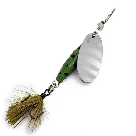 Nikkelöidyt lipat antavat tälle Shysterille sen klassisen ulkonäön; mallin kehitti alun perin Glen Evans, ennen kuin tuotanto siirtyi myöhemmin Luhr Jensenin kaltaisille merkeille. Pituudeltaan 7 cm (2 3/4") ja painoltaan 7 g (1/4 oz) oleva yksilö on varustettu erottuvalla vihreällä rungolla, jossa on mustia pilkkuja. Luonnonruskeilla kuiduilla sidottu kolmihaarakoukku antaa vedessä hienovaraisen profiilin, joka täydentää hopeanvärisen lipan välkettä. Varhaisena amerikkalaisena lippauistimena Shysteristä tuli perusvaruste kalastajille niin järvillä kuin virtaavissa vesissä, ja se toimii tehokkaasti jopa erittäin hitaassa uitossa. Tämä Yhdysvalloista peräisin oleva yksilö kantaa tuotekoodia 17009 ja edustaa merkittävää osaa kalastushistoriaa. Vieheen yleiskunto on erinomainen, ja sen osien viimeistely on säilynyt hyvin, ansaiten kuntoluokituksen 5/5.