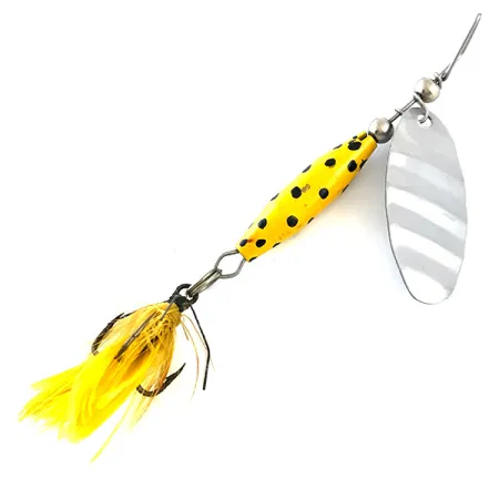 Tämä kirkkaankeltaisella rungollaan ja rohkeilla mustilla pilkuillaan erottuva lippa edustaa palan amerikkalaista kalastushistoriaa alkuperäiseltä valmistajalta, Glen Evansilta. Painoltaan 1/4 oz (7 g) ja kokonaispituudeltaan 2 3/4" (7 cm) olevassa yksilössä on kiillotettu nikkelilippa, johon on lyöty "Shyster"-nimi ja Glen Evans -brändi. Tämä tuotekoodilla 5382 tunnistettu esine on säilynyt 5/5-kunnossa, ja siinä on puhdas maalipinta sekä kirkkaat metalliosat. Glen Evans kehitti tämän mallin USA:ssa ennen kuin siitä tuli muiden kuuluisien valmistajien, kuten Luhr Jensenin, vakiotuote. Rakenteeseen kuuluu painotettu, kapeneva runko ja keltainen sulkakolmihaarakoukku – yhdistelmä, jota on historiallisesti käytetty hitaaseen kelaukseen sekä seisovassa että virtaavassa vedessä. Keltaiset häkilähöyhenet ovat tuuheat ja tiukasti kiinni takakoukussa.