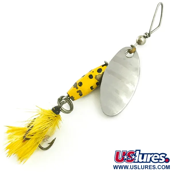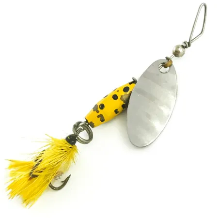 Pisaranmuotoisen lyijyrungon keltainen pilkkumaalaus paljastaa tämän 4g (1/8oz) Glen Evans Shyster -lipan olevan aito palanen amerikkalaista kalastushistoriaa. Pituudeltaan 6 cm (2 1/4") uistin on varustettu sille ominaisella epäsymmetrisellä siiman kiinnityksellä, jonka Glen Evans kehitti ennen kuin malli siirtyi myöhemmin Luhr Jensenin kaltaisten valmistajien käyttöön. Kiillotettuun nikkelilippaan on selkeästi stansattu Shyster-nimi, ja sen perässä on sävyyn sopiva keltainen höyhenkolmihaarakoukku. Tämä yksilö on säilynyt arvokkaasti: maalipinnassa on vain vähäistä kulumista, mikä vastaa 4/5-kuntoarviota. Painotus on suunniteltu hitaaseen kelaukseen sekä seisovassa vedessä että virtauksessa, jolloin lippa pyörii tasaisesti. Jokainen osa metallisista väliholkeista koukun sidontaan on alkuperäinen tuotekoodille 5752.