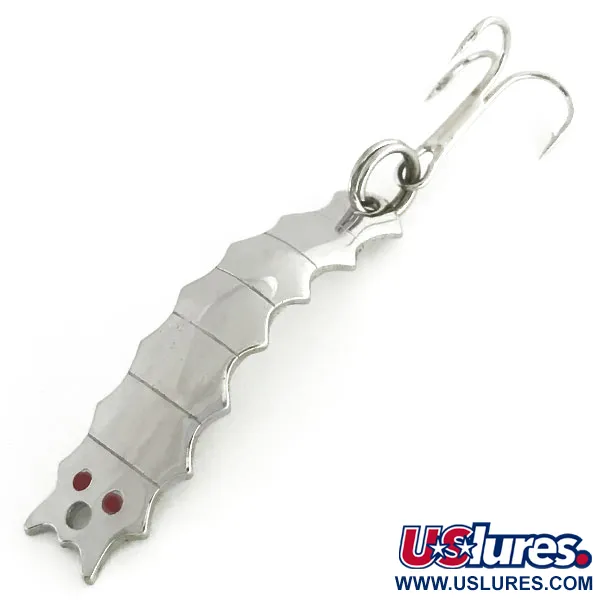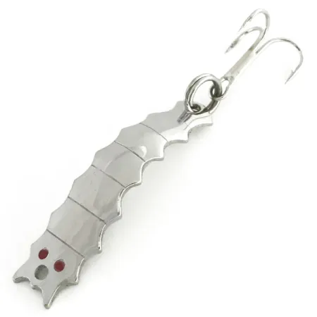 Nikkelöinti antaa kirkkaan heijastavan pinnan tälle 3/16 oz (4,5 g) Goldfish Helgy -uistimelle, joka on klassinen yhdysvaltalainen lusikkauistin jaeltu hyönteismäisellä profiililla. Rungon pituus on 1 3/4" (4,5 cm), ja siinä on sarja harjanteita, jotka vangitsevat valoa useista kulmista, johtaen takapuolen selkeään "GOLDFISH HELGY" -leimaan. Vieheen päässä on kaksi pientä, kirkkaanpunaista silmää ja siisti kiinnityslenkki, kun taas pyrstöpäässä on kestävä uistinrengas ja yhteensopiva nikkelinen kolmihaarakoukku. Tuotekoodilla 8621 varustettu viehe on 5/5-kunnossa, ja sen pinta on kauttaaltaan sileä ja virheetön. Muotoilu jäljittelee helgrammiten eli helvetinkorentotoukan ulkonäköä, joka on monien makean veden kalojen perusravintoa.