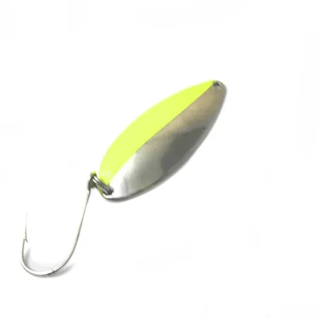 Nikkelöity pinta yhdistettynä kirkkaanvihreään raitaan määrittelee tämän perinteisen amerikkalaisen lusikkauistimen estetiikan. Tämä 5,5 cm (2 1/4") pitkä ja 11 g (2/5 oz) painava Great Lakes Lures -malli (tuotekoodi 0435) on klassinen esimerkki yhdysvaltalaisesta käsityöstä. Rakenne koostuu meistatusta metallirungosta, jonka alapuoli on kiillotettua nikkeliä, kun taas yläpuoli on jaettu paljaan metallin ja kirkkaanvihreäksi maalatun osion välillä. Tässä yksilössä on hyvin säilynyt viimeistely, mikä oikeuttaa 4/5 kuntoluokitukseen, ja heijastavilla pinnoilla on vain kevyitä jälkiä. Yksihaarakoukku on kiinnitetty tukevasti järeällä uistinrenkaalla perään, ja se on tarkoitettu heittokalastukseen tai vetouisteluun avovedessä. Tämä kaksisävyinen viimeistely tarjoaa selkeän visuaalisen kontrastin voimakkaasti välähtelevän nikkelin ja vihreän tehosteen näkyvyyden välillä.