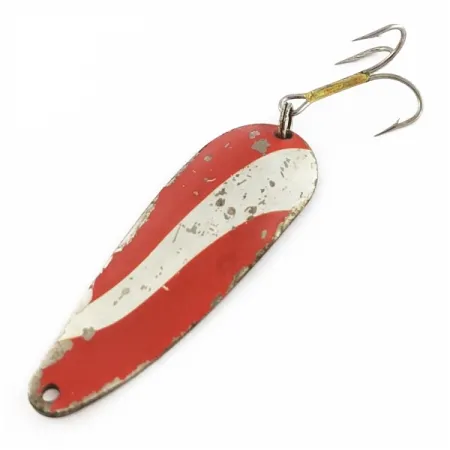 Tämä tasan 6 cm (2 1/4") pituinen lusikkauistin on Weberin Gypsy King 0 -malli, joka on merkkinä vahvasti osa amerikkalaista kalastustarvikehistoriaa. Sen pinnoite koostuu selkeästä punavalkoisesta diagonaaliraidoituksesta nikkelinvärisellä pohjalla, ja se on luetteloitu tuotekoodilla 24209. Viehe painaa 11 g (2/5 oz), ja siinä on näkyvää kulumaa, kuten useita maalihalkeamia ja pintajälkiä rungossa, mikä vastaa kuntoluokitusta 4/5. Rakenne koostuu pisaranmuotoisesta metallirungosta, johon on stanssattu siimalenkki, sekä tukevasta kolmihaarakoukusta, joka on kiinnitetty perään vahvalla uistinrenkaalla. Tässä Yhdysvalloissa valmistetussa vieheessä on tallella alkuperäiset osat, mukaan lukien kookas metallinen kolmihaarakoukku.