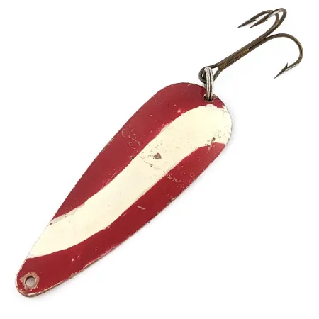 Takapuolen kuparointi toimii pohjana 'Gypsy King 1' -leimalle, joka osoittaa vieheen olevan aito Yhdysvalloissa valmistettu Weller-uistin. Lusikkauistimen pituus on 7 cm ja paino 17 g, ja sen metallirunkoa koristaa ikoninen puna-valkoinen vinoraitakuvio. Tämä yksilö (tuotekoodi 22831) on kuntoluokassa 4/5, ja siinä on vähäistä, normaalia kulumista. Pieniä maalipinnan lohkeamia on nähtävissä siimalenkin lähellä ja reunoilla, joista kuparinen pohjamateriaali kuultaa läpi. Varustukseen kuuluu kestävä pronssattu kolmihaarakoukku ja teräksinen uistinrengas, ja se on suunniteltu heittokalastukseen. Taustapuolen käsinkirjoitettu merkkilogo ja koon '1' leima luovat konkreettisen yhteyden 1900-luvun puolivälin uistinvalmistukseen.