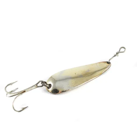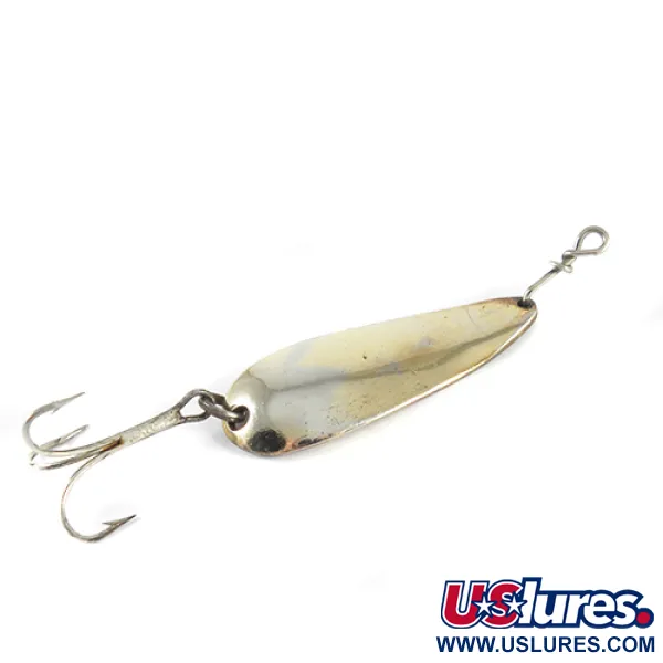 12,5 g (2/5 oz) paino varmistaa, että tämä Hagen's lusikkauistin saavuttaa syvyyden nopeasti heitettäessä virtaavaan veteen. Koveralle puolelle on leimattu suoraan metalliin "HAGEN BAIT CO. MILW. WIS.", mikä viittaa sen valmistuspaikkaan Milwaukeessa, Yhdysvalloissa. Kultaviimeistelty runko on pituudeltaan 5 cm (2") ja siinä näkyy rehellistä käytön jälkeä kuntoluokituksella 3/5, pinnan palveltua jo monissa heitoissa. Varustukseen kuuluu perinteinen kolmihaarakoukku uistinrenkaassa ja viehelukko kärjessä turvallista siimakiinnitystä varten. Tuotekoodilla 1549 tunnistettava lusikka on muotoilultaan selkeä ja yksinkertainen, ja se on optimoitu kestämään pitkiä kalastussessioita.