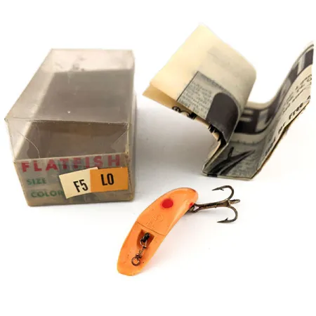 Kirkas oranssi maali ja rohkeat punaiset täplät määrittelevät LO-värityksen tässä 4,5 cm (1 3/4 tuuman) muovisessa vieheessä. Detroitissa, Michiganissa sijaitsevan Helin Tackle Co. -yhtiön työpajoilta peräisin oleva Helin Flatfish F5 on kevytmalli, joka painaa 2 g (1/16 oz). Kalastajat ja keräilijät tunnistavat LO-merkinnän alkuperäisen laatikon päätyetiketistä, joka on säilynyt erittäin selkeänä. Tämä kyseinen viehe, joka on luetteloitu tuotekoodilla 12205, on käyttämätön yksilö ja aivan samassa kunnossa kuin tehtaalta lähtiessään. Pakkaus sisältää alkuperäisen läpinäkyvän muovikannen ja historiallisen paperisen käyttöohjeen, jossa kerrotaan hitaista soututekniikoista, joilla houkutellaan lajeja kuten taimenta ja ahvenkaloja. Varustukseen kuuluu yksi vatsaan kiinnitetty kolmihaarakoukku ja pieni leikari, joissa molemmissa on hyvin säilyneen esineen puhdas metallipinta. Pieniä F5-malleja suosittiin historiallisesti hienovaraiseen esittelyyn lammissa ja pienissä puroissa.