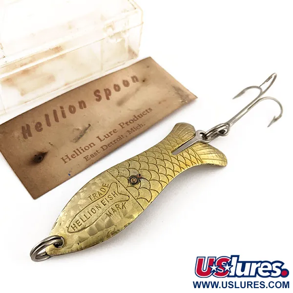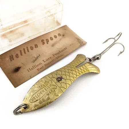 Tähän Michiganissa valmistettuun lusikkauistimeen on lyöty "TRADE HELLION FISH MARK" -leima suoraan metalliin, ja se edustaa East Detroitin Hellion Lure Products -yhtiön klassista aikakautta. Messinginsävyisessä, 7 cm (2 3/4") pitkässä rungossa on syvälle kaiverrettu suomukuvio ja selkeä kalanmuotoinen siluetti. Tämä käyttämätön yksilö, jonka kuntoluokitus on 6, on säilynyt erinomaisessa kunnossa ja sen mukana tulee alkuperäinen läpinäkyvä muovikotelo sekä "Hellion Spoon" -pahvitausta. Uistin painaa 12 g (2/5 oz), ja se on varustettu tukevalla uistinrenkaalla kärjessä ja yhdellä kolmihaarakoukulla pyrstöosassa. Tuotekoodilla 11770 ja väri-nimityksellä "Crystal" merkitty metallipinta on kirkas ja puhdas. Alkuperäinen pakkaus kertoo sen olevan kotoisin East Detroitista, Michiganista, säilyttäen palan paikallista amerikkalaista kalastusvälinehistoriaa.