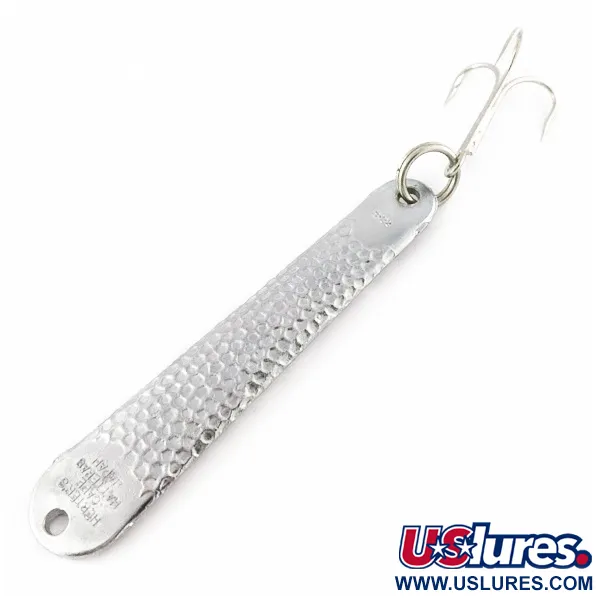 Tämä 42 gramman painoinen ja vankka nikkelilusikka on suunniteltu syviin vesiin ja vaativaan merikalastukseen. Rungolla on pituutta 10 cm, ja siinä on selkeä taottu pinta, joka on suunniteltu heijastamaan valoa, muuttuen tyveä kohti sileäksi stanssatuksi pinnaksi. Tämä kyseinen yksilö, tuotekoodilla 24356, edustaa aikakautta, jolloin amerikkalainen Herter's Inc. hankki korkealaatuisia kalastusvälineitä Japanista legendaarisiin postimyyntiluetteloihinsa. Cape Hatteras -nimi viittaa Pohjois-Carolinan rannikon vaativiin vesiin, mikä korostaa uistimen muotoilua suurten petokalojen pyyntiin. Nikkelipinnoite on erittäin puhdas, ja uistin on saanut kuntoluokituksen 5/5; stanssattu merkintä 'Herter's Cape Hatteras Japan' on edelleen terävä ja helposti luettavissa. Se on varustettu tukevalla uistinrenkaalla ja kirkkaalla kolmihaarakoukulla, ja pään osassa on siististi porattu reikä siiman kiinnittämistä varten.