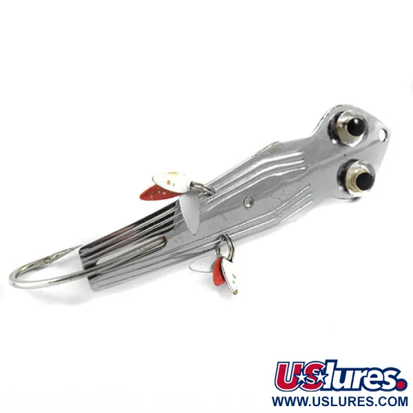 Tässä uistimessa on erottuva kaksipuolinen metallirakenne: toisella puolella on kirkas nikkeliviimeistely, kun taas kääntöpuoli on messinginvärinen. Painoltaan 1/2 unssia (14,2 g) ja pituudeltaan 3 1/4 tuumaa (8,25 cm), tämä Herter's Wobbling Jig (tuotekoodi 0937) on valmistettu Japanissa ja se soveltuu painavaksi vieheeksi heittokalastukseen tai vertikaalijigaukseen. Runkoon on meistetty pitkittäisiä harjanteita, ja nikkelipuolella on kohotetut mustat silmät, joille vastapainona ovat messinginvärisellä puolella olevat oranssit silmätäplät. Pienet metalliset lippalehdet on kiinnitetty keskiosaan uistirenkailla, ja niissä on hopean sekä punavalkoisen maalin yhdistelmä. Yksilö on kunnoltaan 4/5, ja sen metallipinnat ovat hyvin säilyneet, vaikka alkuperäiset pyrstöhöyhenet puuttuvatkin kiinteästä yksittäiskoukusta.