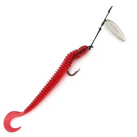 Perinteinen nikkeliviimeistelty pajunlehtilippa, johon on selkeästi leimattu Hildebrandt-nimi, toimii tämän 20404-vieheen pääasiallisena houkuttimena. Painoltaan 3/16 unssia (4,5 g), yhdistelmä koostuu perinteisestä lippavarresta ja läpikuultavasta punaisesta pehmo-osasta. Tämä 15 cm (6") uritettu toukkajigi on asennettu yksittäiskoukkuun, mikä tarjoaa näyttävän profiilin heittokalastukseen vaihtelevissa ympäristöissä. Hildebrandt Spinnersin Yhdysvalloissa valmistama viehe osoittaa tarkkaa langanpunontaa ja korkealaatuista viimeistelyä lipassa. Tuote on 5/5-kunnossa, nikkelipinnoitteen heijastaessa valoa kirkkaasti ja punaisen pehmo-osan säilyttäessä alkuperäisen notkeutensa. Koukku on edelleen terävä ja se on asetettu tukevasti toukkaosan uritettujen segmenttien sisään.