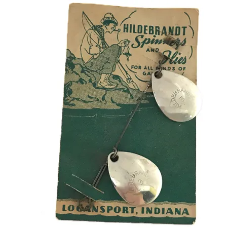 Nikkelöidyt pisaranmuotoiset lehdet, joihin on leimattu ikoninen «HILDEBRANDT 3» -merkintä, korostavat tämän vintage-pienvälineen toiminnallista käsityötaitoa. Painoltaan 3/32 unssia (3 g), tämä kaksoislippakokoonpano on edelleen kiinnitetty alkuperäiseen kuvitettuun myyntikorttiinsa, jossa mainitaan sen alkuperä Logansportissa, Indianassa. Pakkauksen kääntöpuoli tunnistaa tämän «aitona No. C1» HILDEBRANDT SPINNERinä (No. C Idaho Spinner), joka on suunniteltu erityisesti kalastettavaksi perinteisten perhojen rinnalla kaikkien urheilukalojen pyyntiin. Tuotekoodilla 8519 luetteloitu näyte sisältää kaksi kirkasta lehteä puhtaassa lanka-akselissa. Metalliosien viimeistely on säilynyt poikkeuksellisen hyvin, heijastaen valoa aivan kuten vuosikymmeniä sitten Yhdysvalloissa. Tämä malli edustaa 1900-luvun alkupuolen lähestymistapaa monilehtisiin uistimiin, hyödyntäen yksinkertaisia mekaanisia liitoksia, jotta lehdet voivat pyöriä vapaasti keskiakselin ympäri. Näyte on 5/5-kunnossa, säilyttäen alkuperäisen kiiltonsa ja rakenteellisen eheytensä, kun taas taustakortti toimii historiallisena todisteena merkin juurista Keskilännessä.
