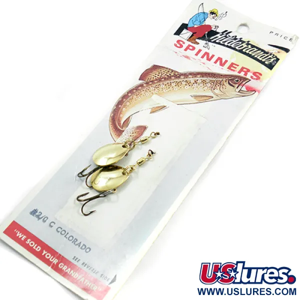 Kultaus heijastaa valoa upeasti näissä kahdessa pienessä Colorado-tyylisessä lipassa, jotka ovat yhä kiinni alkuperäisessä Hildebrandt-myyntikortissaan. Painoltaan 1,4 g (3/64 oz) kappale, nämä lipat edustavat klassista amerikkalaista uistinmuotoilua, jota yritys mainosti kuuluisalla iskulauseellaan "aimme isoisällesi". Lippoihin on lyöty Hildebrandt-nimi ja kokomerkinnät, mikä takaa niiden aitouden vintage-keräilijöille. Jokaiseen kultaiseen lippaan on kiinnitetty pieni, terävä kolmihaarakoukku laadukkailla osilla ultrakevyttä taimenen tai ahvenen kalastusta varten. Tuotekoodilla 1882 tunnistettu sarja on käyttämätön alkuperäisessä pakkauksessaan, vaikka kortissa näkyykin hieman ajan tuomaa kulumaa. Valmistettu Yhdysvalloissa; messinkileikarit ja uistinrenkaat ovat edelleen tiukat ja toimintakuntoiset. Colorado-lipan pisaramuoto on perinteinen malli, joka on suunniteltu nousemaan ylemmäs vedessä hitaalla kelauksella sekä virrassa että seisovassa vedessä.