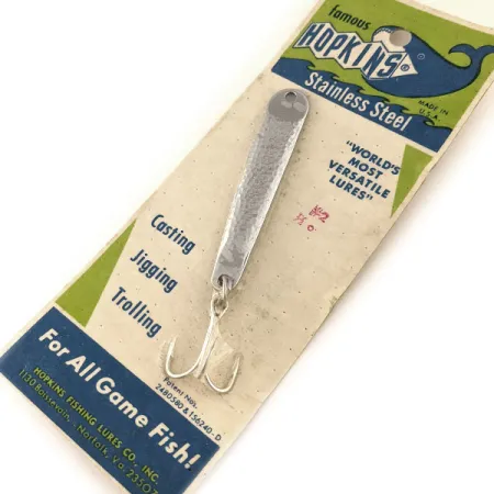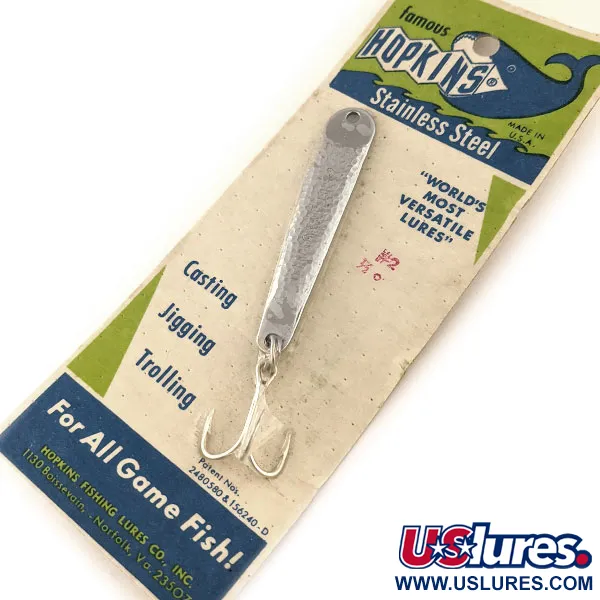 Erottuva vasaroitu nikkelipinta määrittelee tämän perinteisen Hopkins No=Eql -lusikkauistimen, jonka tekstuuroitu ruostumaton teräspinta heijastaa valoa tehokkaasti. Pituudeltaan 6,5 cm (2 1/2") ja painoltaan 14 g (1/2 oz) oleva malli 11401 on valmistettu umpinaisesta ruostumattomasta teräksestä, mikä estää pinnan lohkeilun tai kuoriutumisen ajan myötä. Tämä nimenomainen yksilö on käyttämätön ja on edelleen kiinni alkuperäisessä 'famous HOPKINS' -myyntikortissaan, joka on kunnoltaan 6. Valmistaja on Hopkins Fishing Lures Co., Inc. Norfolkissa, Virginiassa. Vieheessä on tinattu kolmihaarakoukku ja se on merkitty patenttinumeroilla 2480380 ja 156240-D. Pakkaus korostaa sen monipuolisuutta heittokalastukseen, jigaukseen ja uisteluun kaikille petokaloille sekä makeassa että suolaisessa vedessä. Kortin kääntöpuolella on teknisiä vinkkejä tehokkaaseen käyttöön, suositellen vaihtelevia kelausnopeuksia ja tiettyjä syvyyksiä jigaukseen rakenteiden, kuten siltojen tai laiturreiden läheisyydessä.