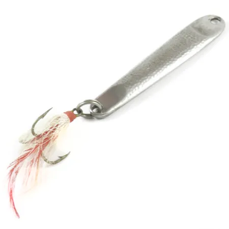 Vasaroidun metallirungon kylkeen on selkeästi leimattu "HOPKINS NO=EQL @ 3", joka on tämän 35 g (1 1/4 oz) painoisen jigin tavaramerkki. Hammered Nickel -viimeistely antaa 9 cm (3 1/2") pinnalle erottuvan tekstuurin, joka heijastaa valoa monisuuntaisesti. Tämä USA:ssa valmistettu viehe (tuotekoodi 3285) on varustettu sidotulla kolmihaaralla, jossa on valkoisia ja punaisia kuituja visuaalisen kontrastin luomiseksi. Metalli on kirkas ja erinomaisessa kunnossa (arvosana 5/5). Siististi porattu kiinnitysreikä takaa kestävän liitoksen raskaaseen merikalastukseen tai syvän veden makean veden kalastukseen.
