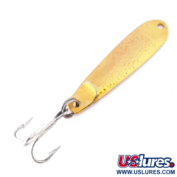14 g (1/2 oz) paino antaa tälle kompaktille 5,5 cm (2 1/4") pystypilkille tehokkaaseen vertikaalikalastukseen tarvittavan tiheyden. Pinnoitettu vasaroidulla kullalla, ja metallirunko on suunniteltu heijastamaan valoa eri suuntiin sen liikkuessa vesipatsaassa. Ikoninen "HOPKINS SHORTY" -nimi on meistattu pintaan osoituksena sen perinteistä amerikkalaisena uistimena. Jokainen yksilön 10426 osa on erinomaisesti säilynyt, ja sen kuntoluokitus on 5/5. Takana on terävä hopeinen kolmihaarakoukku, joka on kiinnitetty vankalla uistinrenkaalla, ja kärjessä on valmis kiinnitysreikä.