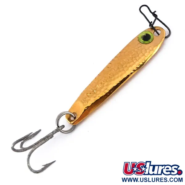 Tämän taotun lusikkauistimen vasaroitu kultapinta kimaltelee valossa tarjoten tekstuurikontrastin, joka on määritellyt Hopkins-uistimet vuosikymmenten ajan. Painoltaan 1/3oz (9g) ja pituudeltaan 1 3/4" (4,5cm) oleva Shorty S1 on klassinen malli, jonka metallirunkoon on stanssattu "S1". Tämä yksilö, tuotekoodiltaan 10042, on 5/5-kunnossa, ja siinä on kirkas, heijastava pinta sekä terävät koukut. Silmä, pieni vihreäreunainen yksityiskohta lähellä siimakiinnitystä, tuo hienovaraisen kiintopisteen uistimen päähän. Yhdysvalloissa valmistettu täysteräsrakenne takaa kestävyyden, ja valmiiksi kiinnitetty viehelukko mahdollistaa nopean vaihdon. Sen yksinkertainen mutta tehokas pisaramainen profiili on varustettu tukevalla kolmihaarakoukulla ja vahvalla uistinrenkaalla.