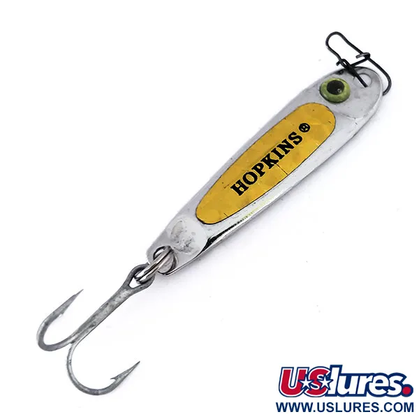 Nikkelipinnoite peittää tämän USA:ssa valmistetun 5,5 cm pystypilkin rungon. 11 grammaa painavassa vieheessä on tuotekoodi 10114 ja tunnistettava 'SMOOTHIE'-brändäys kirkkaassa sini-violetissa etiketissä. Keltainen silmä toimii selkeänä iskupisteenä päässä, kontrastina kiillotetulle metallipinnalle. Tämä Hopkins-yksilö on 5/5-kunnossa, ja siinä on alkuperäiset pinnat sekä puhtaat koukut. Pyrstössä on vankka kolmihaarakoukku ja nokassa on tehdasasenteinen viehelukko nopeaa siimaan kiinnittämistä varten.